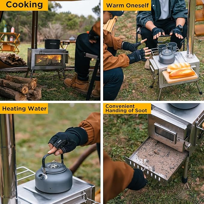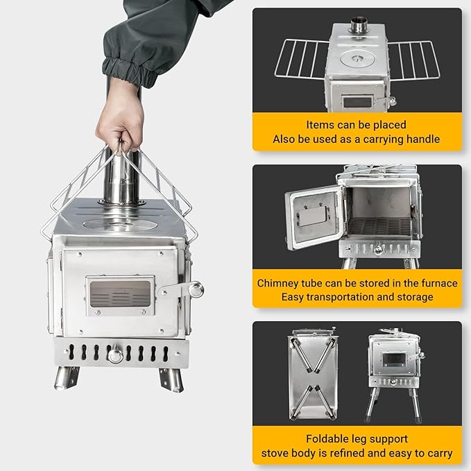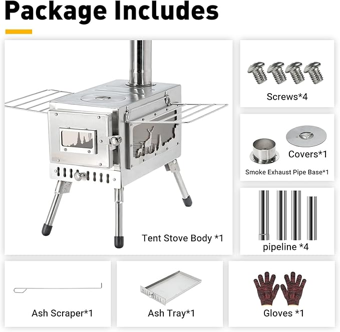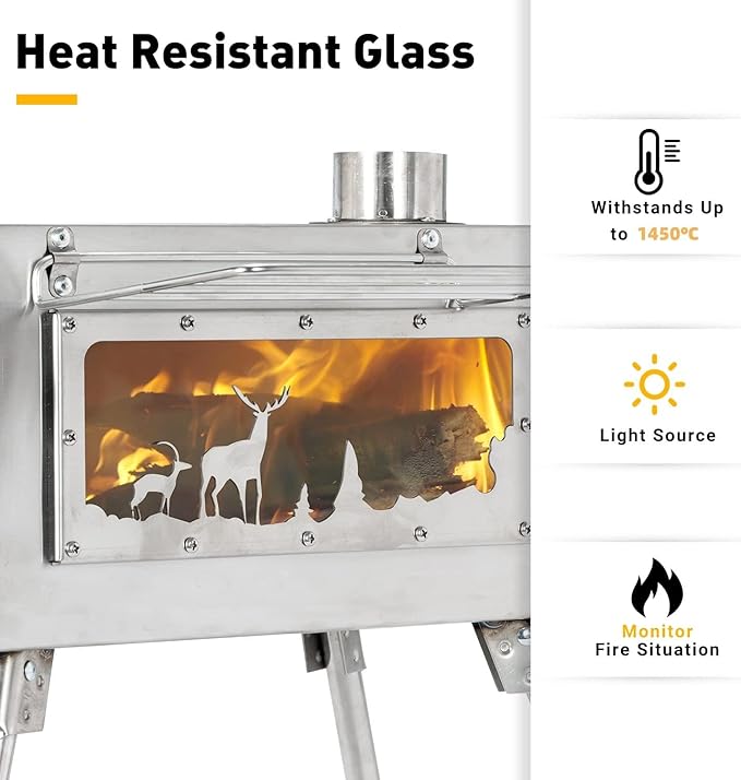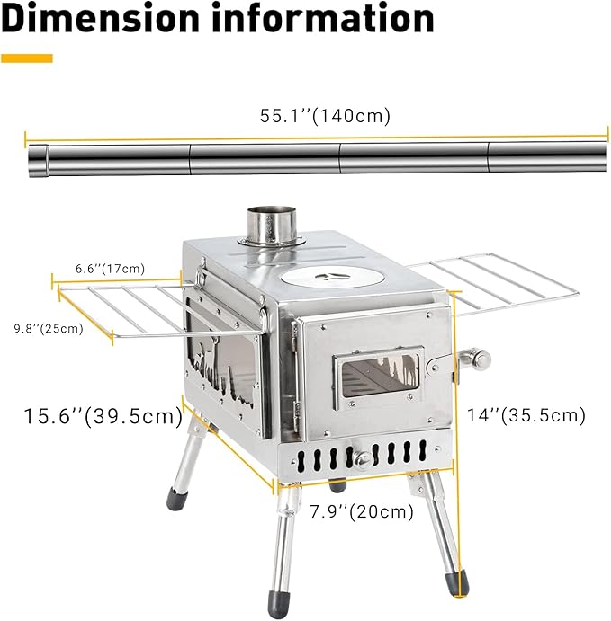 - ⛓【Stainless Steel Chimney Pipe】-- Equipped with 4x chimney pipes for stability and proper ventilation. Available for bell tents with furnace tube vents; chimney tubes adjust ventilation to suit your heat needs. The design of the fire holes on the surface of the stove also increases the heating efficiency and is a great version for your camping/hunting trips with friends or family.