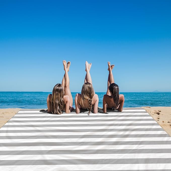 Large Beach Blanket Sandproof Waterproof, Grey Stripe Compact Beach Mat Sand Free, Portable Lightweight Picnic Mat w/Stakes & Corner Pockets for Outdoor, Travel, Camping, Hiking