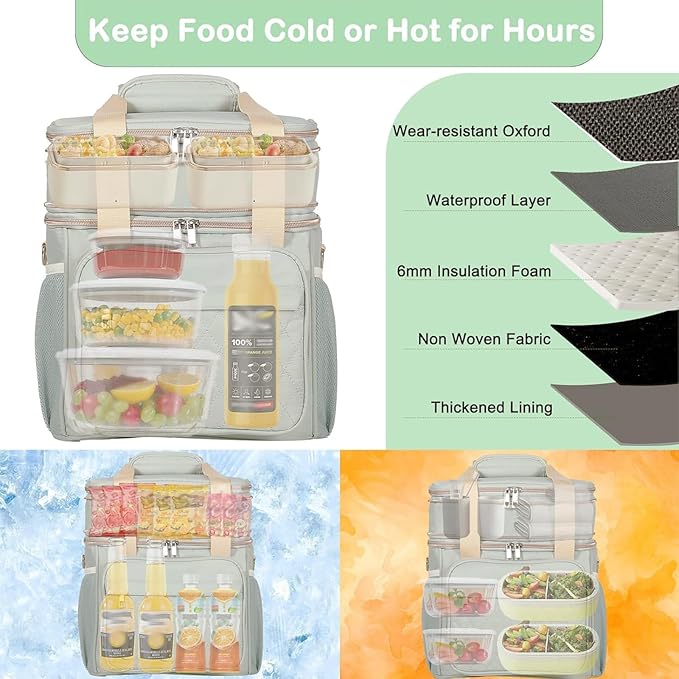 - Large Capacity with Expandable Design: Fits 20 Cans of soda(350ml). Dual Compartments for different uses, the top compartment of the women lunch box is expandable, increasing the capacity by 4L. Normal size with 12L. Handy to use for work, outing, picnic, camping, road trip, and so on