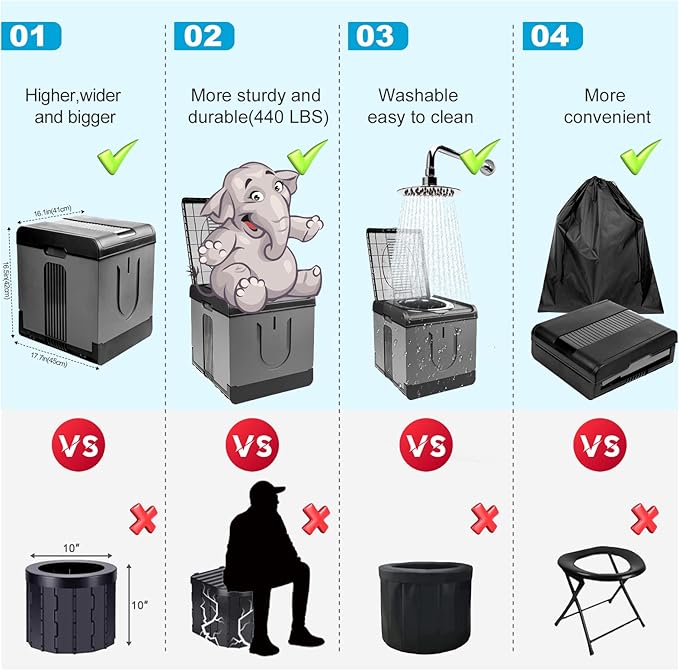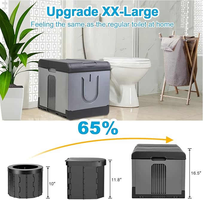 - Extra Large and More Comfortable: Are you looking for a portable toilet that is just like the one in your home? Here it is! This Upgrade portable toilet is 17.7"L*16.1"W*16.5"H.That is higher, wider and rectangle toilet seat offer more rooms than most other collapsible toilets. Which is more suitable for adults, bring you more relax and comfortable experience when outside.
