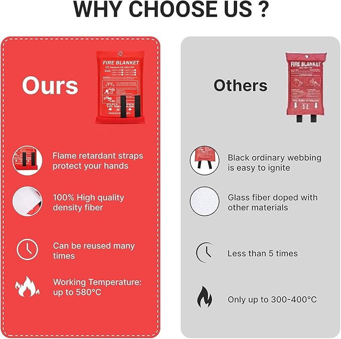- HIGH-TEMPERATURE RESISTANT: The fire suppression blanket can isolate high temperatures up to 1076℉( 580℃), enabled by it's Composed of two layers of 100% flame retardant woven fiberglass fabric and an inner layer of fire retardant film, meets safety blanket standards set by CE and SGS, helping people extinguish the fire source promptly in case of a sudden fire.