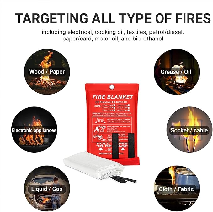 - All Types of Fires: The fire protection blanket can put out almost all types of fires, including electrical, cooking oil, textiles, petrol/diesel, paper/card, motor oil, and bio-ethanol. A must have in your kitchen, backyard and vehicle survival kit for protection.