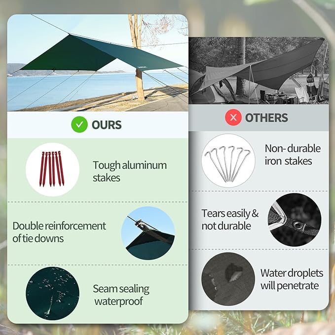- High-quality complete set of accessories: One set can fulfill your camping needs without having to buy any other items. Package includes 1 tent tarp with 11 webbing straps, 6 rust-proof aluminum ground pegs, 8 adjustable nylon ropes, 1 ultralight carry bag for all your belongings, plus a super handy extra carry bag for accessories