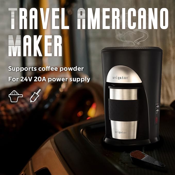 - Portable Coffee Makers for Car: Simply plug into your 24-volt cigarette lighter in car to start brewing fresh coffee. With Avigator travel coffee maker by your side, coffee breaks are no longer limited by location. Whether you're navigating the open highway, exploring scenic byways in an RV, or simply commuting to work, you can now enjoy a freshly brewed cup of coffee whenever the mood strikes. Say goodbye to hunting for a café and hello to the convenience of on-the-go coffee enjoyment