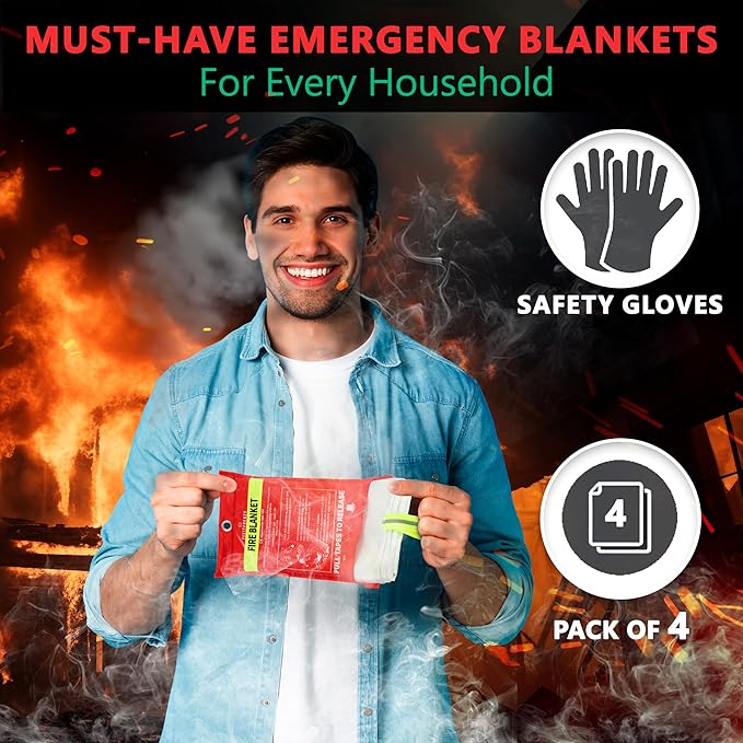 Fire Blankets Emergency for Home, 4 Pack 40"x40" with Pair of Gloves & 4 Hooks, Fire Extinguisher for Kitchen, Fiberglass Fire Blankets for Fireplace, Grill, Office, Warehouse.