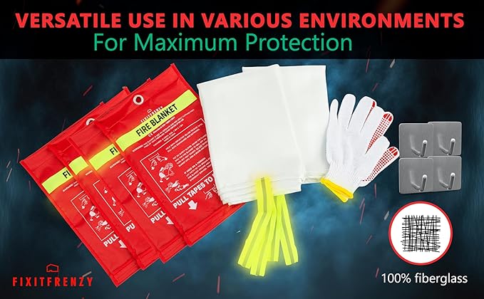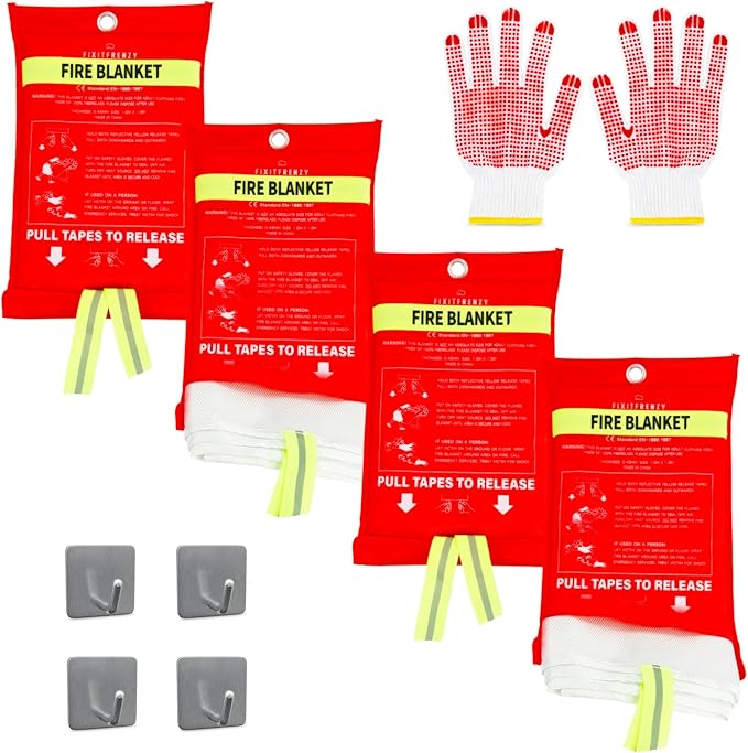 - ✅ COMPLETE SET: Unleash the power of safety with our 4-pack fire suppression blanket set, 4 Hooks and complete with 1 pairs of protection gloves. Safeguard hands against fiberglass fibers.