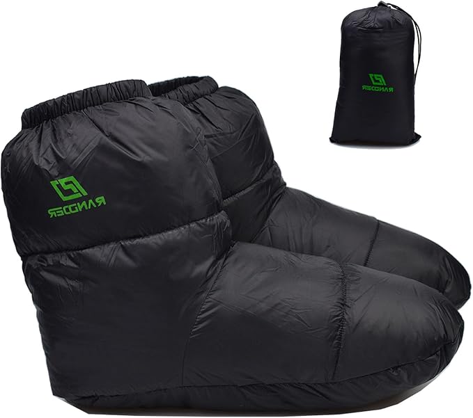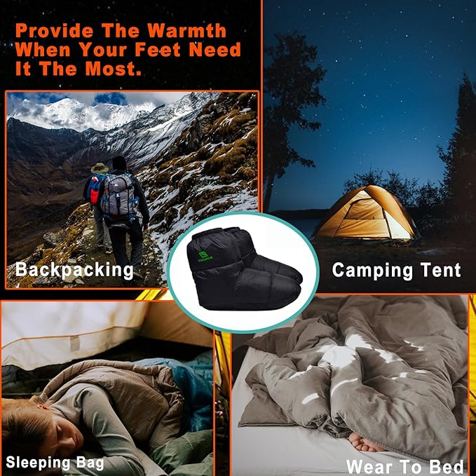- Great Gift for Campers/Backpackers. Warm up down booties keep feet toasty warm while sleeping in camping sleeping bag, camp tent, RV or around the house/bed/chair! Great for sitting/sleeping/laying down.