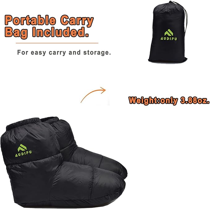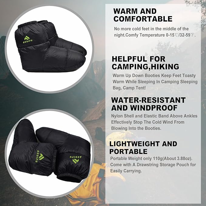 - DOWN BOOTIES WARM SOCK: Super Value Premium Warm Up Down Booties for Men and Women Keep Feet Toasty Warm While Sleeping In Camping Sleeping Bag, Camp Tent! Great for Sitting/Sleeping/Laying Down(Not For Walking).