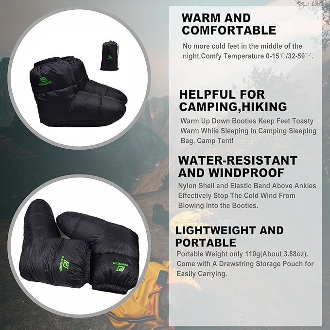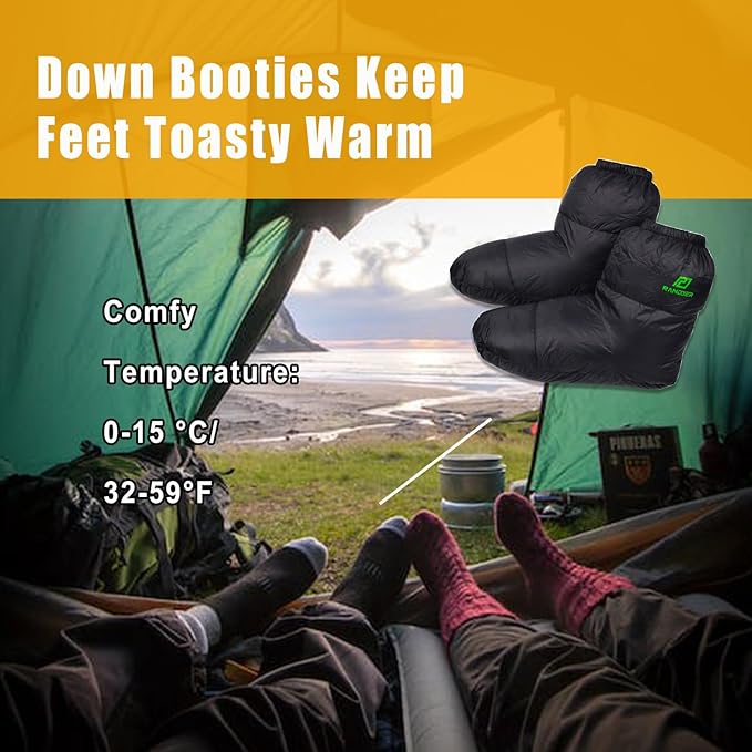 - Great Gift for Campers/Backpackers. Warm up down booties keep feet toasty warm while sleeping in camping sleeping bag, camp tent, RV or around the house/bed/chair! Great for sitting/sleeping/laying down.