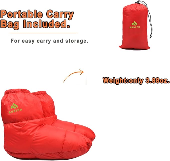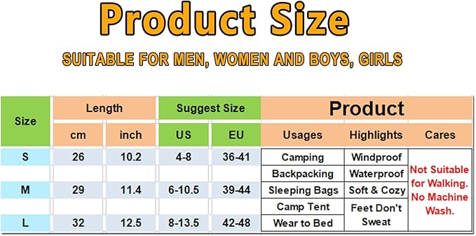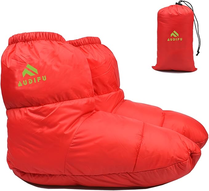 • Great Gift for Campers/Backpackers. Warm up down booties keep feet toasty warm while sleeping in camping sleeping bag, camp tent, RV or around the house/bed/chair! Great for sitting/sleeping/laying down.