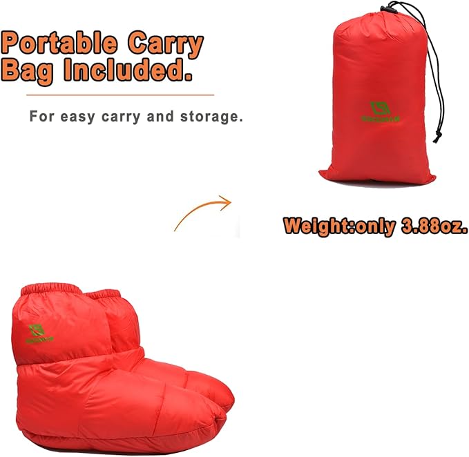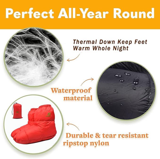 - DOWN BOOTIES WARM SOCK: Super Value Premium Warm Up Down Booties for Men and Women Keep Feet Toasty Warm While Sleeping In Camping Sleeping Bag, Camp Tent! Great for Sitting/Sleeping/Laying Down(Not For Walking).