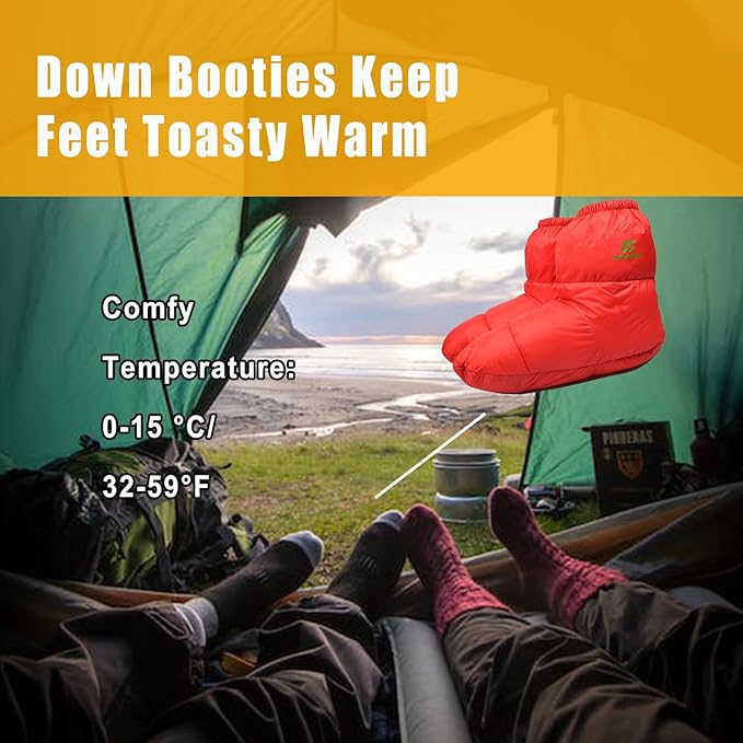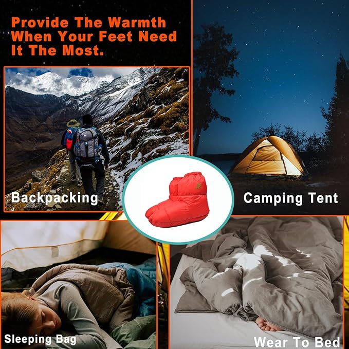 - Great Gift for Campers/Backpackers. Warm up down booties keep feet toasty warm while sleeping in camping sleeping bag, camp tent, RV or around the house/bed/chair! Great for sitting/sleeping/laying down.