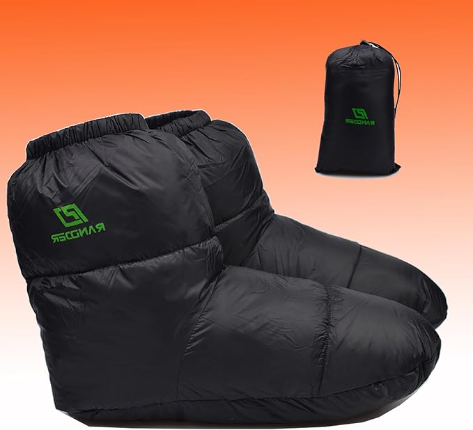 - Great Gift for Campers/Backpackers. Warm up down booties keep feet toasty warm while sleeping in camping sleeping bag, camp tent, RV or around the house/bed/chair! Great for sitting/sleeping/laying down.