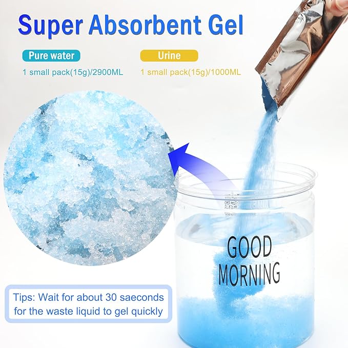 - 【The Most Absorbent Gel】Our camping toilet gel powder is mainly made of SAP absorbent polymer, which can absorb and retain a large amount of liquid, such as urine, vomit, or other liquid waste (Each pack can instantly absorb up to 2900ML pure water/1000ml urine).