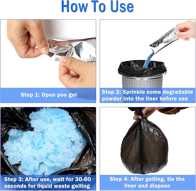 - 【ECO-Friendly Toilet Gel Powder】After using poo gel, throw it into the trash or pour it into the soil; This safe ECO-absorbent gel can naturally degrade in 7 days through soil composting or in just 5 days when exposed to sunlight.