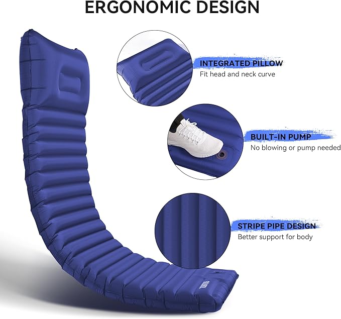 - ERGONOMIC DESIGN: Camping sleeping pad comes with a built-in pillow that relieves pressure on your back and neck, making it comfortable to sleep on your back or side. The smooth tube design evenly supports your body's pressure points