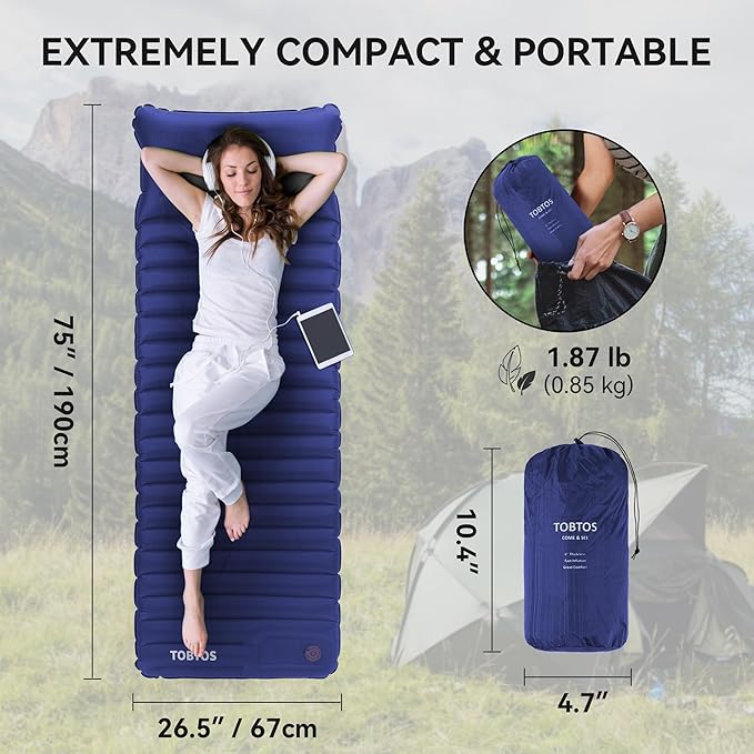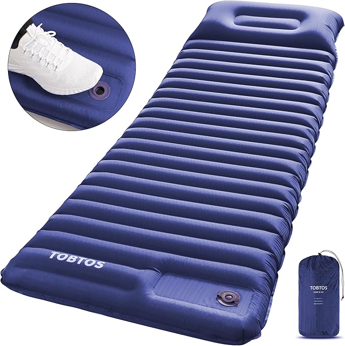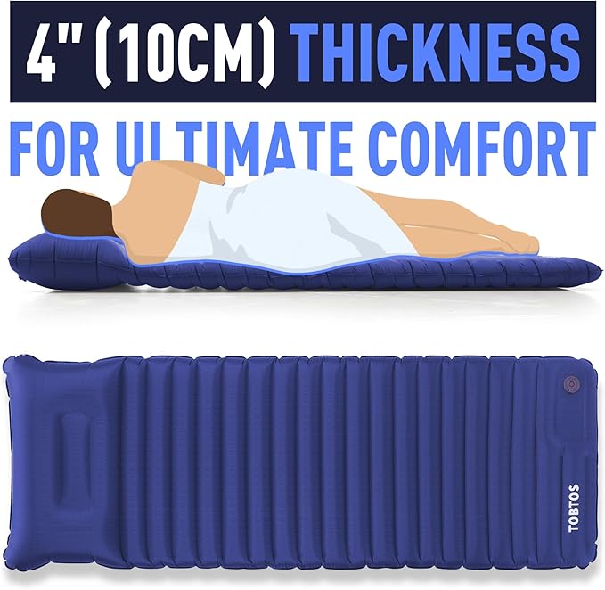 TOBTOS Inflatable Sleeping Pad for Camping with Pillow, 4" Thick Camping Mat with Built-in Foot Pump, Compact Air Mattress for Camping, Hiking, Backpacking (Blue)