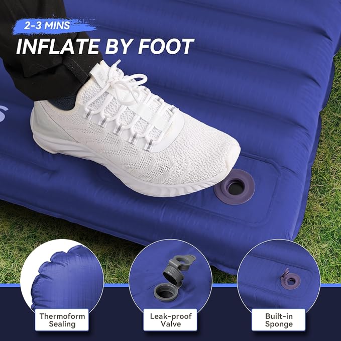 - EASY INFLATE & DEFLATE: No more blowing your camping mat with your mouth! It has a built-in foot pump that allows you to inflate it with your feet in 2-3 minutes. Simply open the deflation valve and it will deflate in seconds
