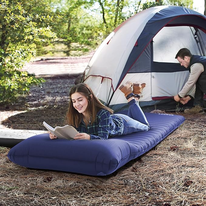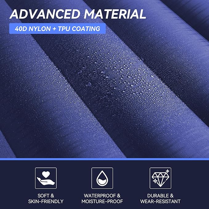 - CAMPING GRADE FABRIC: This sleeping pad is made of super tough 40D nylon with TPU coating that completely insulates it from moisture. The edges of the camping pad are heat sealed, you don't have to worry about air leaks or tears