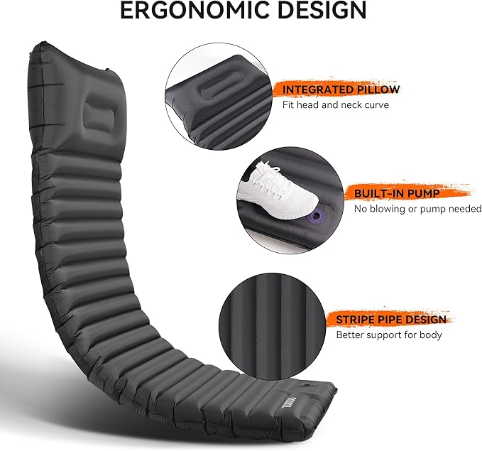 - ERGONOMIC DESIGN: Camping sleeping pad comes with a built-in pillow that relieves pressure on your back and neck, making it comfortable to sleep on your back or side. The smooth tube design evenly supports your body's pressure points