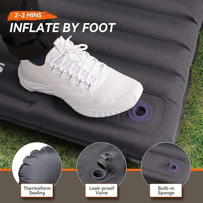 - EASY INFLATE & DEFLATE: No more blowing your camping mat with your mouth! It has a built-in foot pump that allows you to inflate it with your feet in 2-3 minutes. Simply open the deflation valve and it will deflate in seconds