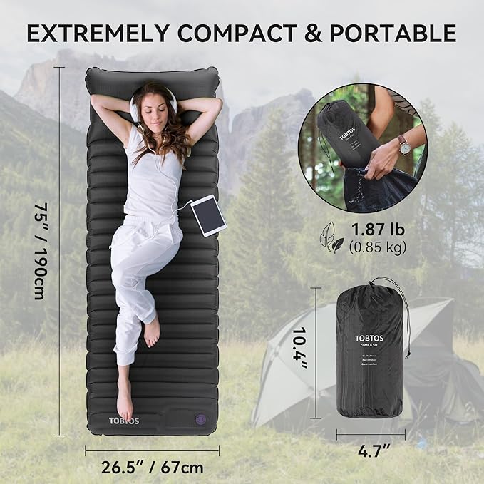 - PORTABLE TO CARRY: The camping air mattress weighs only 1.87 pounds and can be folded into a compact size of 10.4"x4.7", which won't add any burden to your trip. It can also be used for guests to stay overnight at home