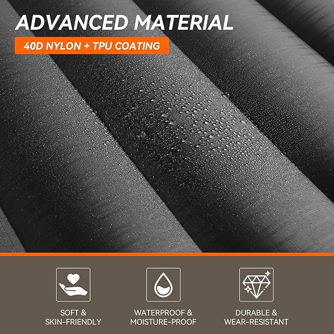 - CAMPING GRADE FABRIC: This sleeping pad is made of super tough 40D nylon with TPU coating that completely insulates it from moisture. The edges of the camping pad are heat sealed, you don't have to worry about air leaks or tears