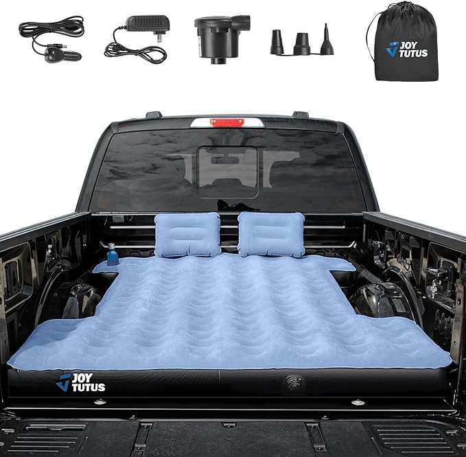 JOYTUTUS Truck Mattress for Camping, Air Bed with Inflatable Pillow for 5.5-5.8Ft, Full-Size Thicken Sleeping Pad with Cup Holder, Blow Up Bed for Car Truck Pickup F150, Grey Blue