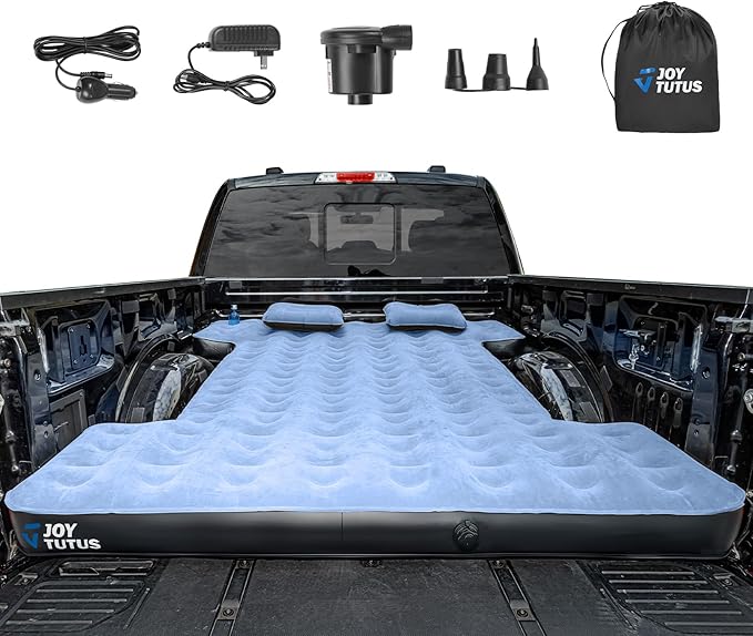 JOYTUTUS Truck Mattress for Camping,Air Bed with Inflatable Pillow for 6.4-6.7Ft,Full-Size Thicken Sleeping Pad with Cup Holder, Blow Up Bed for Car Truck Pickup F150, Grey Blue