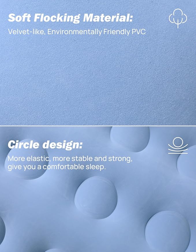 - 【Cavity Design】: Featuring three independent air chambers, our design significantly reduces the risk of air leakage while enhancing durability and longevity. The surface and pillows are crafted from a soft, velvet-like flocking fabric for a plush feel, and the high-quality PVC bottom helps prevent leaks.