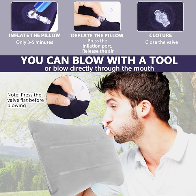 - 🏞️ 🔄 𝐈𝐍𝐅𝐋𝐀𝐓𝐀𝐁𝐋𝐄 𝐃𝐄𝐒𝐈𝐆𝐍 𝐅𝐎𝐑 𝐂𝐎𝐌𝐏𝐀𝐂𝐓 𝐒𝐓𝐎𝐑𝐀𝐆𝐄: 🏞️ 🔄 The inflatable camping pillows for backpacking inflatable design allows for a quick and easy setup, you can blow by mouth or inflate with a pump for 3-5 minutes and you'll have a soft, comfortable pillow! When not in use, the pillow can be deflated for easy storage and convenient for traveling and camping.