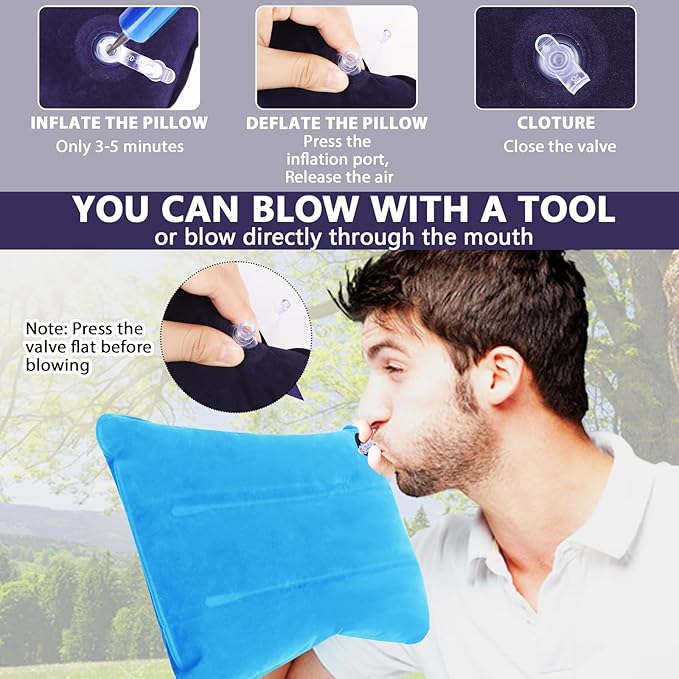 - 🏞️ 🔄 𝐈𝐍𝐅𝐋𝐀𝐓𝐀𝐁𝐋𝐄 𝐃𝐄𝐒𝐈𝐆𝐍 𝐅𝐎𝐑 𝐂𝐎𝐌𝐏𝐀𝐂𝐓 𝐒𝐓𝐎𝐑𝐀𝐆𝐄: 🏞️ 🔄 The inflatable camping pillows for backpacking inflatable design allows for a quick and easy setup, you can blow by mouth or inflate with a pump for 3-5 minutes and you'll have a soft, comfortable pillow! When not in use, the pillow can be deflated for easy storage and convenient for traveling and camping.