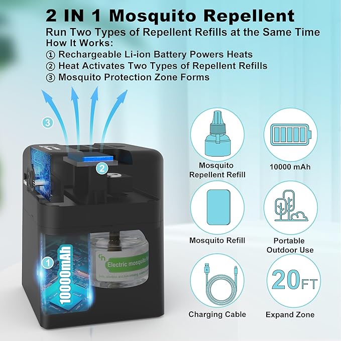 Mosquito Repeller Rechargeable 10000mAh Indoor Outdoor with 20' Mosquito Protection Zone,includes 280 Hr Working Refill (1 bottle Refill and 20 Pcs Refill)