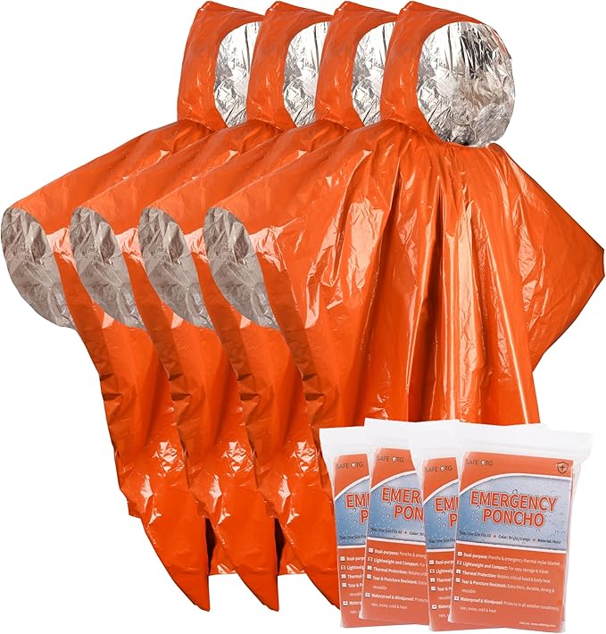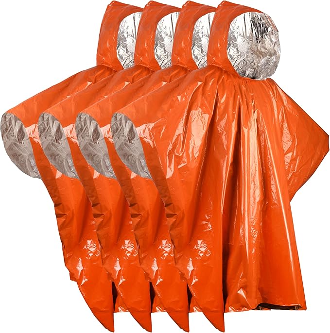 Emergency Survival Rain Poncho 4 pack Thermal Mylar Space Blanket Orange Life Ponchos Blankets with Hood Waterproof for Adults Car Outdoor Activities Hiking Camping Gear Equipment and Supplies