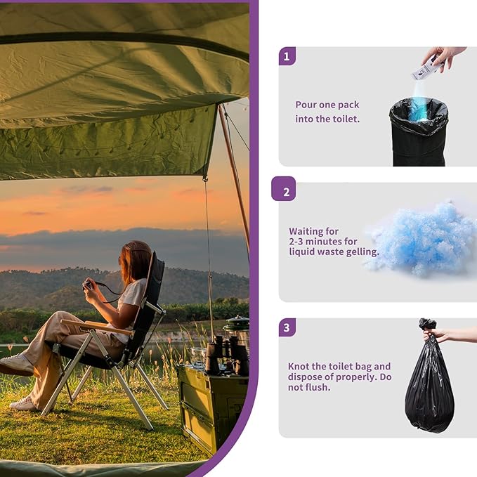 - 【Eco-Friendly & Degradable Gel】This portable toilet gel packets for poop is mainly made of environmentally friendly non-toxic biodegradable absorbent polymer, which can absorb urine, vomit, or other liquid waste and gives off a light lemon scent. This absorbent gel can naturally degrade within several days by soil compost or under direct exposure to sunlight. .The eco poo gel will not cause any burden to the environment, allowing you to enjoy nature with peace of mind!