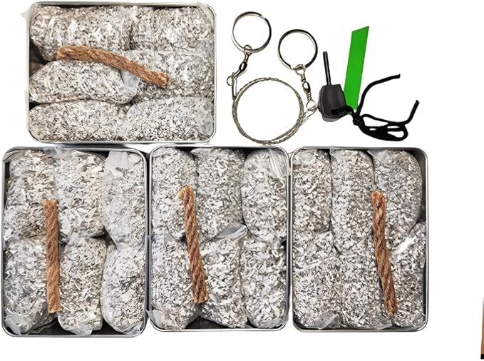 Emergency Fire Starter Magnesium 6 Bags Wax Infused Jute Rope Ferro Rod Striker Saw Wire for Camping Hiking Bushcraft Hurricane + Tin Container