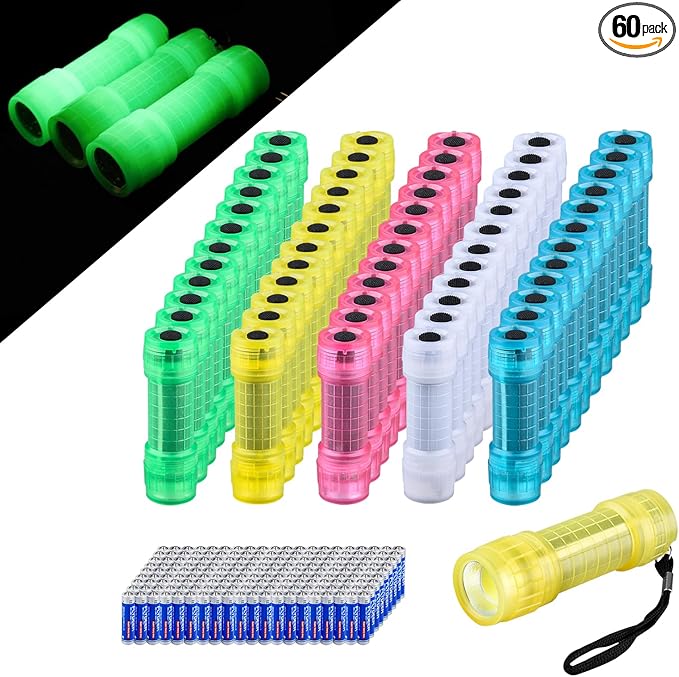 - 【Packing Content】You will receive 60 pieces of bright flashlights pack in 5 different colors, including green, yellow,blue,white and pink, 6 pieces for each color; The bright and vibrant colors can easily catch children's attention; Each flashlight has 3 built in AAA batteries, a total of 90 AAA batteries included for easy daily using.