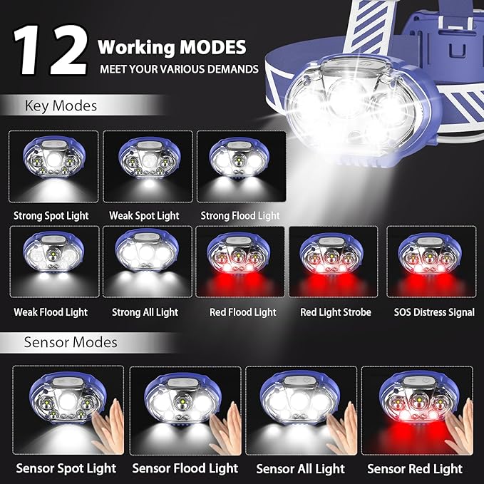 - IPX4 Waterproof and 12 Modes for Any Situation: Our headlamp flashlight is built to withstand splashes of water from all angles, so you can take it on any weather, rain or shine. The head light has 12 modes controlled by 2 buttons. One button switch 8 key modes, the other button switch 4 sensor modes. Our led headlamp is the ultimate adaptable tool for any situation, ensuring you have the right light for any adventure