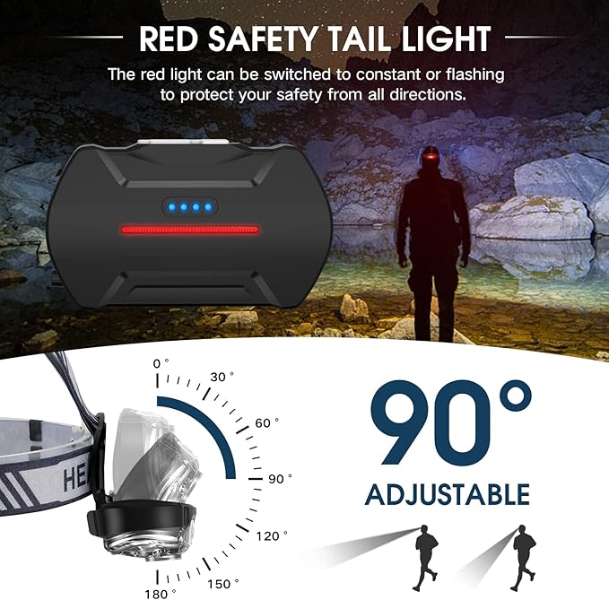 - Special Feature : Adjustable Headband, 12 Lighting Modes, White Light & Red Light, 90°Pivotable Head, Red Safety Warning Light Adjustable Headband, 12 Lighting Modes, White Light & Red Light, 90°Pivotable Head, Red Safety Warning Light
