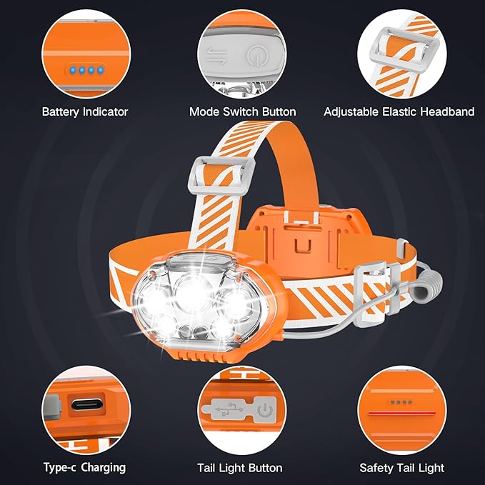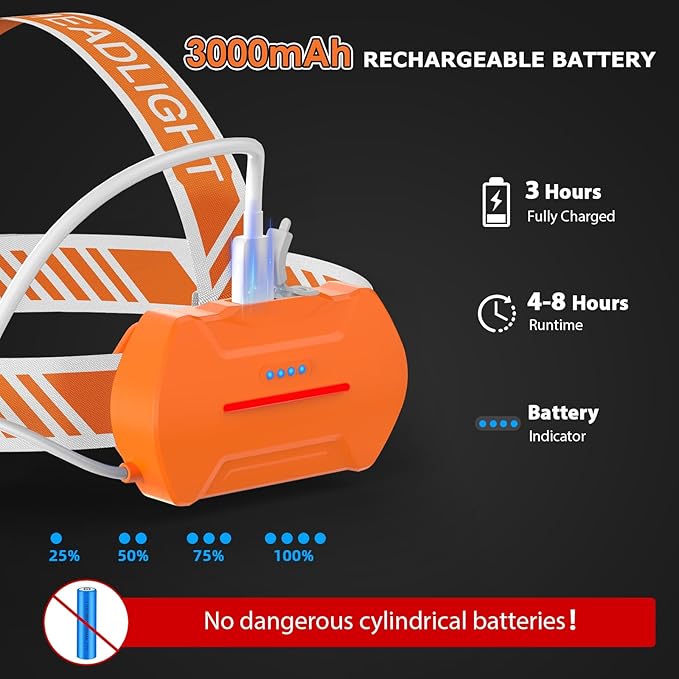 - USB Rechargeable and Long Battery Life: Do not use unsafe cylindrical batteries! Our rechargeable headlamp usa built-in rechargeable batteries to ensure your safety first. Our head lamps support Type-C USB charging, making it convenient for everyday use. The headlamp rechargeable can provide 4-8 hours of long-lasting power in different lighting modes, so you can adventure without worrying about running out of juice