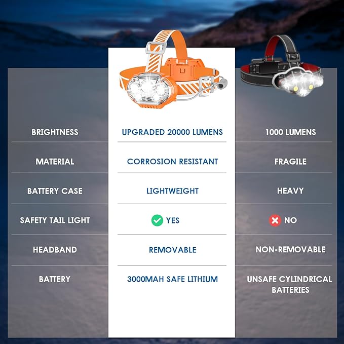 - Illuminate Your World in All Directions: Designed in the USA, MIOISY head lamp features 5 powerful XPG and LED bulbs that provide up to 20000 lumens max, ensuring that you can see everything around you clearly. Perfect for exploring caves, night running, cycling, fishing, camping, construction work and other outdoor adventure activities. The red safety warning light switch is located on the back battery compartment to ensure all direction safety and emergency response