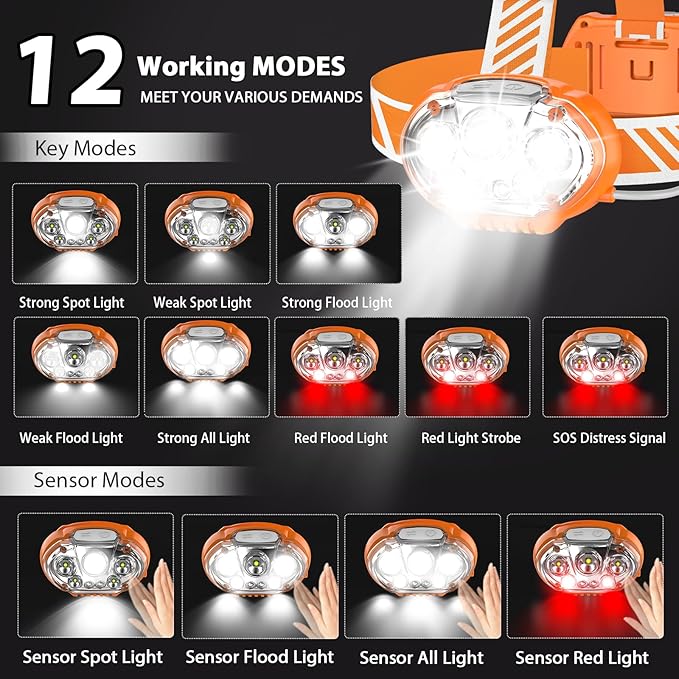 - IPX4 Waterproof and 12 Modes for Any Situation: Our headlamp flashlight is built to withstand splashes of water from all angles, so you can take it on any weather, rain or shine. The head light has 12 modes controlled by 2 buttons. One button switch 8 key modes, the other button switch 4 sensor modes. Our led headlamp is the ultimate adaptable tool for any situation, ensuring you have the right light for any adventure