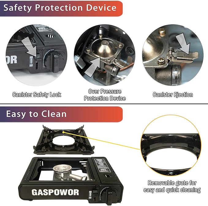 - 🔥【Easy-to-Use and Clean Gas Burners for Cooking Indoor】GASPOWOR single burner camp stove is safe and easy to use, even for novices. The porcelain-coated grate of the burner camping is removable, allowing for quickly cleanup, and this gas burner for cooking is resistant to rust.