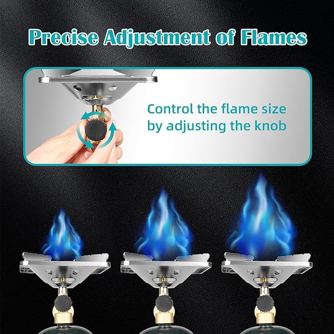 - 🔥【Portable Propane Camping Stove with Precise Flame Adjustment】👉Our propane camping stove is equipped with a valve that controls gas flow, allowing us to accurately control the size of the flame during cooking to meet the flame requirements for cooking different foods. Our camping burner can provide up to 10,000 BTU of heat, allowing you to quickly complete your cooking in a short amount of time. As professional outdoor athletes or participating in outdoor picnics, our backpacking stove is an essential tool.