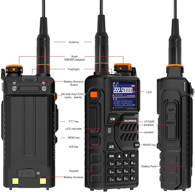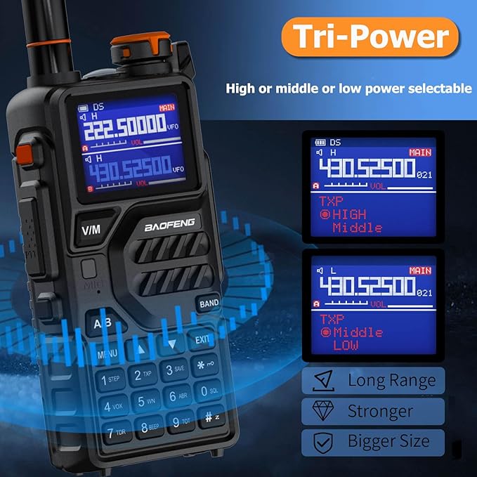 - Upgraded: BAOFENG K5PLUS with 1.77 inch color large screen display, which is convenient for improving visibility when using at night. One touch frequency finder button, 2 seconds copy frequency. VHF(2M)/VHF2(1.25M)/UHF(70CM); High or middle or low power selectable