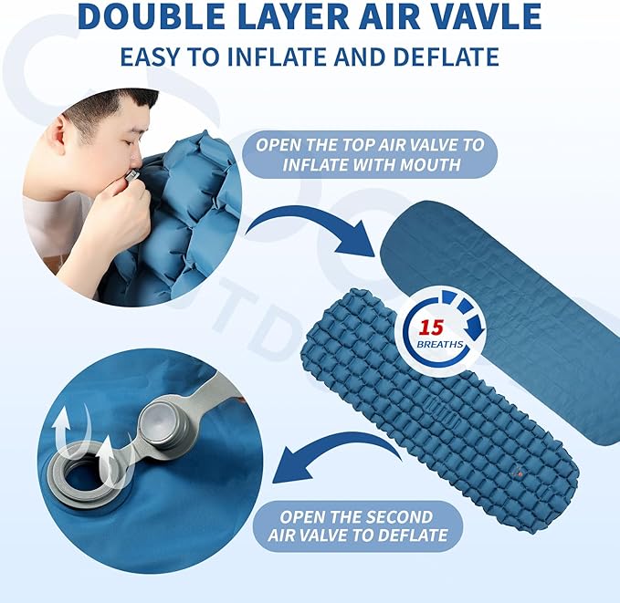 - UNIQUE DESIGN: Our portable camping sleeping mat is composed of numerous air cells that ergonomically. Its airbag design enhances support and evenly distributes pressure, ensuring comfortable night's sleep during your adventures. The inflation valve has a double decked design, the design is convenient. The first layer is for blow (just about 10-15 breaths) or slowly releasing air, allowing you to adjust the mat's softness , open the second layer for quick deflation.The entire process is very easy