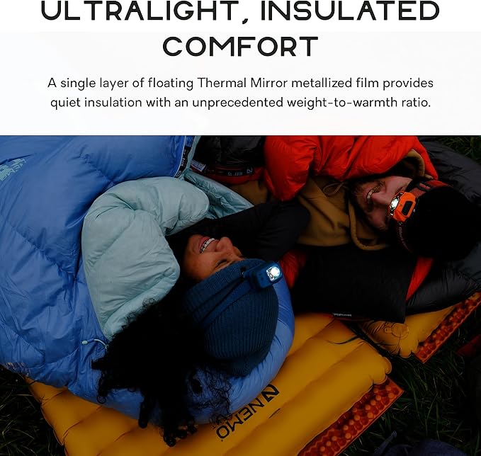 - One layer of floating Thermal Mirror metallized film provides quiet insulation with an unprecedented weight-to-warmth ratio.