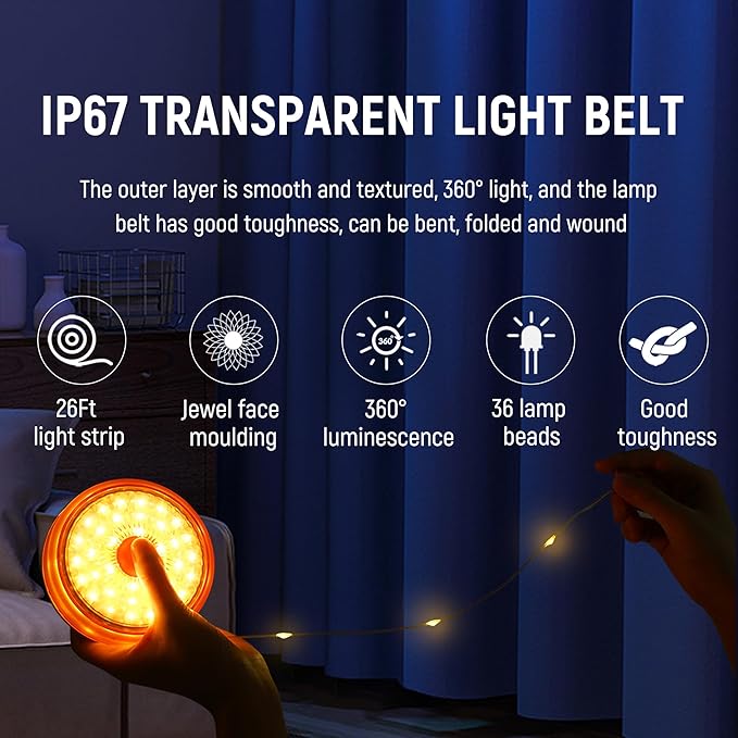 - Waterproof and Suspension design - The camping light rope has an IPX4 waterproof rating, which works well even in wet environments. Hanging design, can be hung on the tent, RV, Christmas tree, tree branches or a variety of supports, very easy to use.