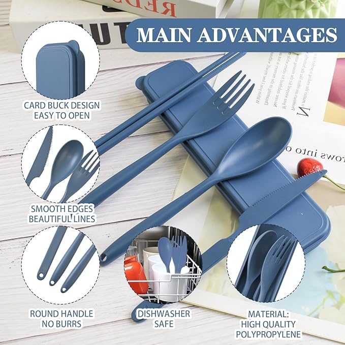Large Reusable Travel Utensils Set with Case, Plastic Silverware Set for Adults Travel Picnic Camping, Portable Flatware Cutlery Set with Chopsticks for Daily Use(Dark Blue)