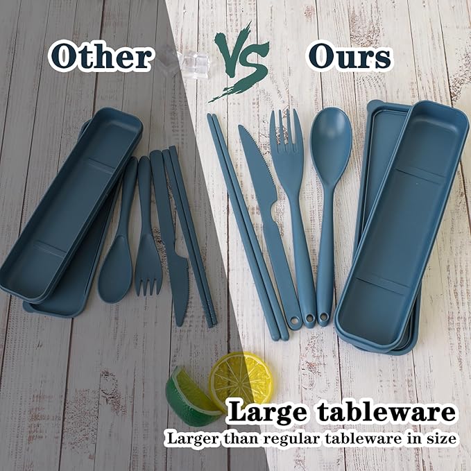 - 【Material and Portability】Our travel utensils are made of high quality plastic and reusable. Traditional stainless steel cutlery is too heavy and difficult to carry. Our colorful sets of flatware sets are small and lightweight for easy portability.